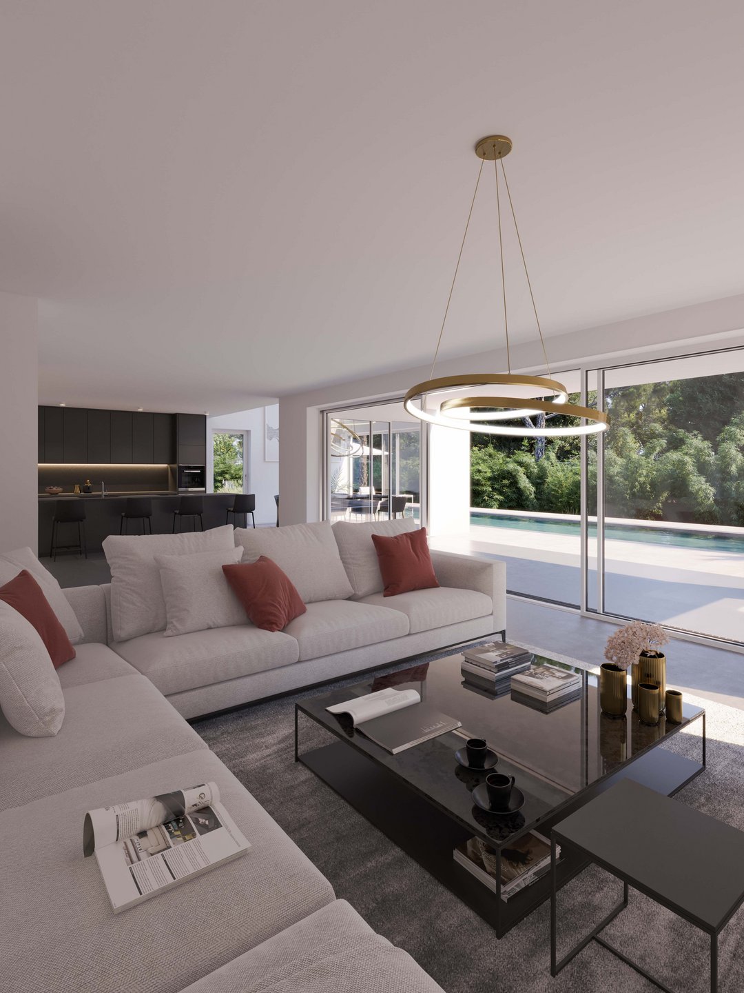 Unter anderem wurden das Wohnzimmer, die Küche und der Außenbereich mit Poolzone visualisiert, was sich ideal zur Vermarktung hochwertiger Architekturobjekte oder zur Präsentation im Kundenumfeld eignet.
