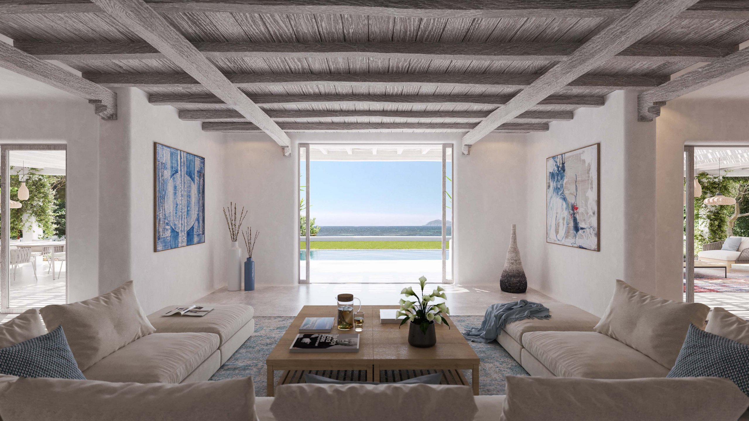 3D-Visualisierung einer luxuriösen weißen Villa auf Ibiza mit großem Pool, mediterraner Architektur und eleganten Outdoor-Lounges – erstellt von gmsvision. Gewinner der European Property Awards 2023–2024 für Architektur und Wohnentwicklung.